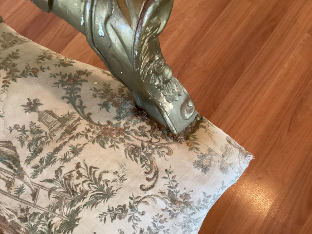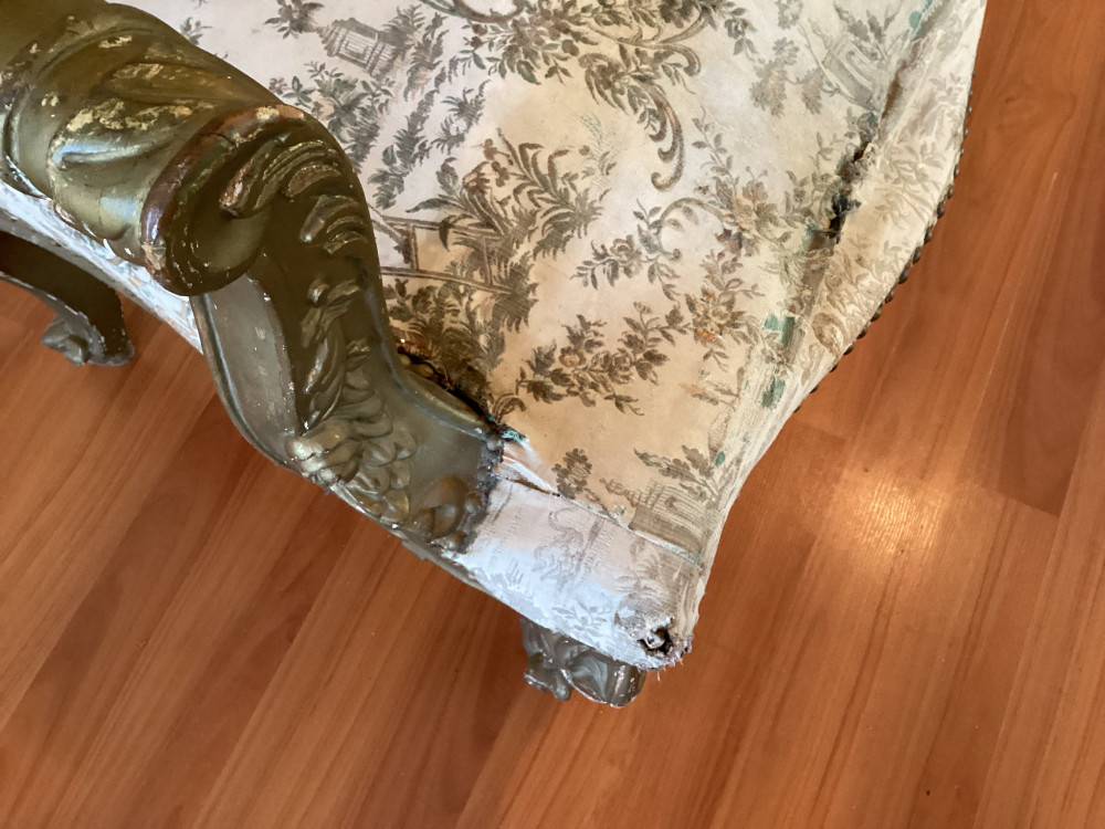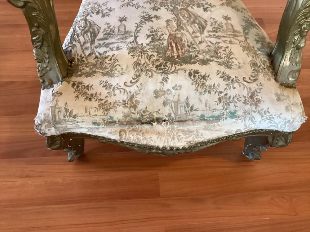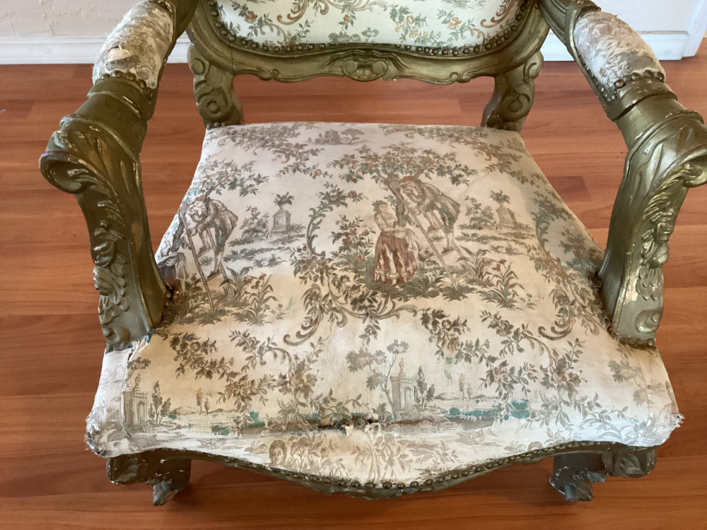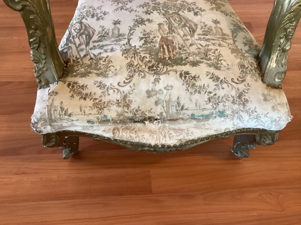 chair has a tear in the fabric of the seat- close up of tear on picture 4. Has some wear on arm rests cushions as well.