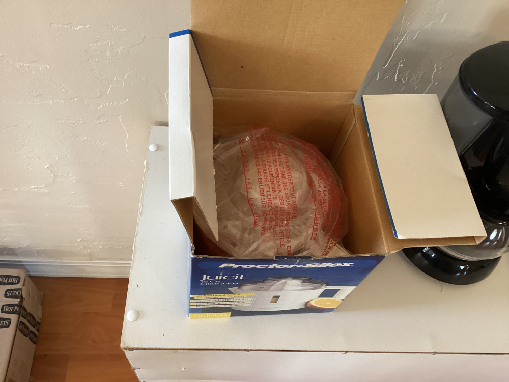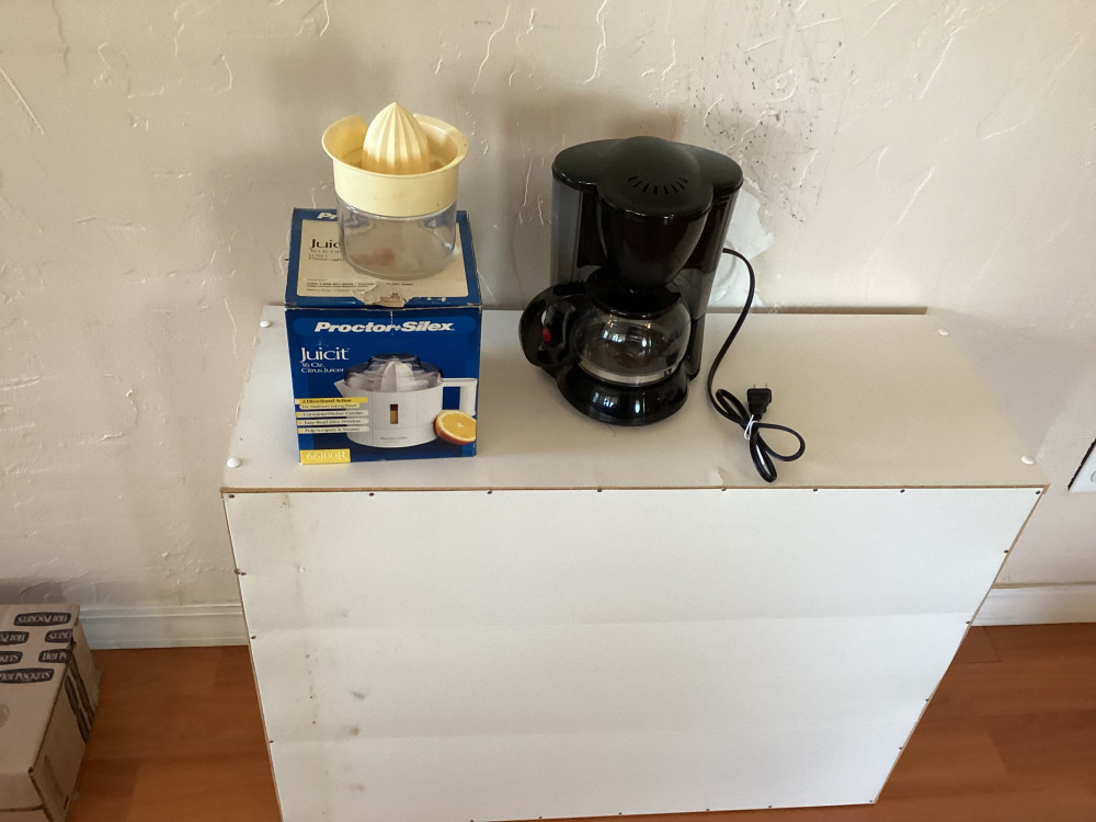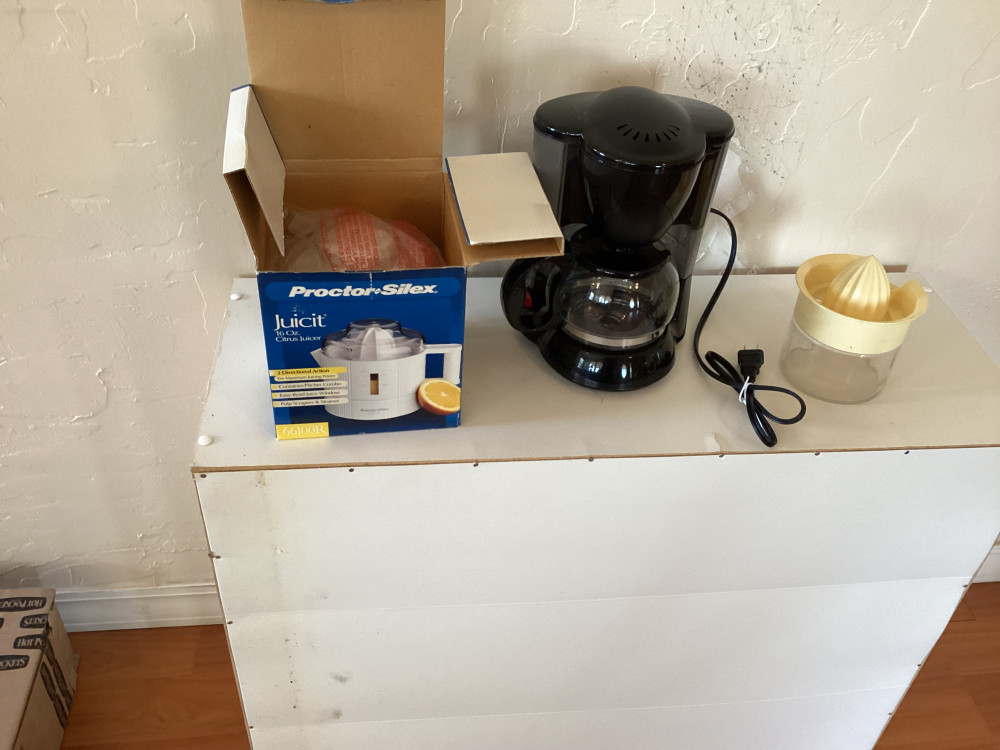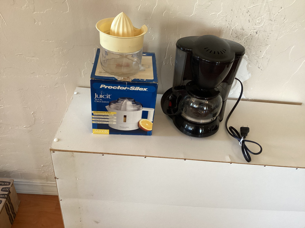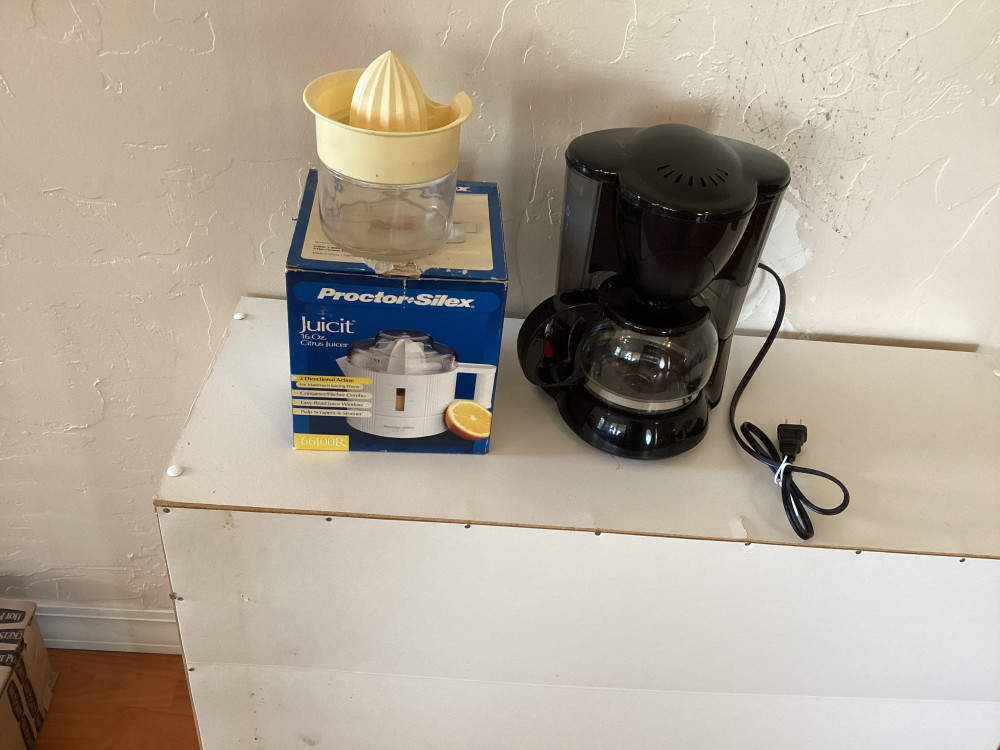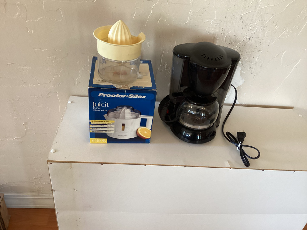 black coffee pot and Proctor Silex 16 oz citrus juicer. Both work
