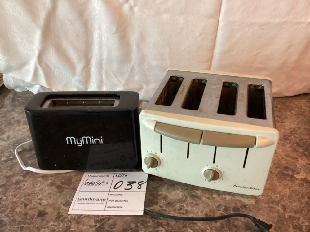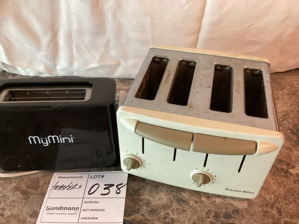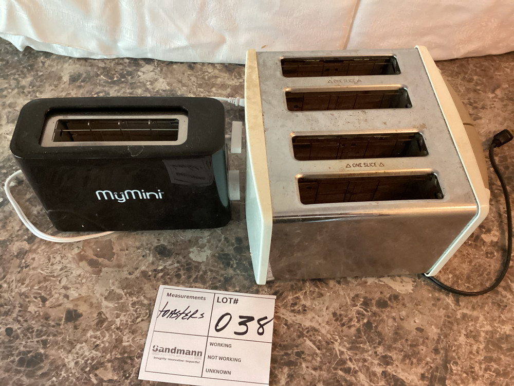 1 black mini toaster and 1 white nd stainless 4 slice toaster