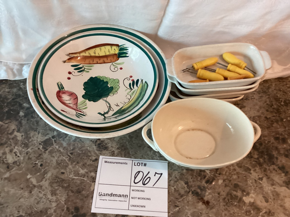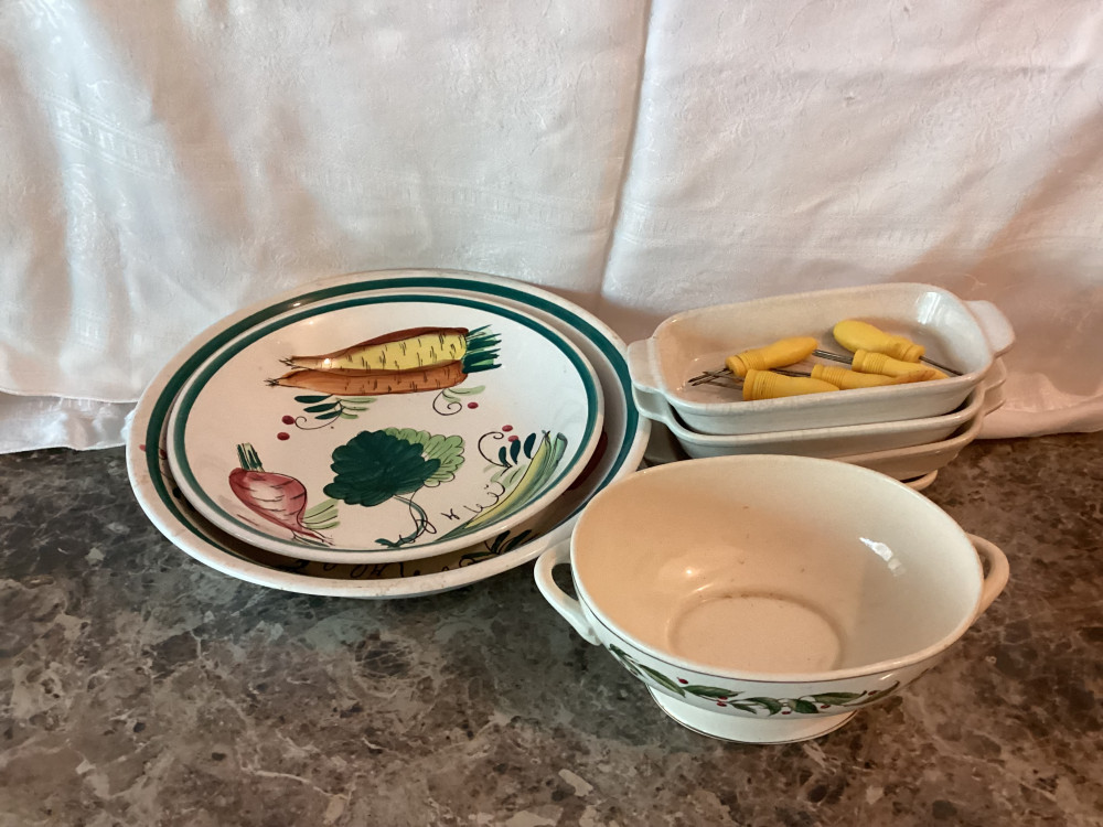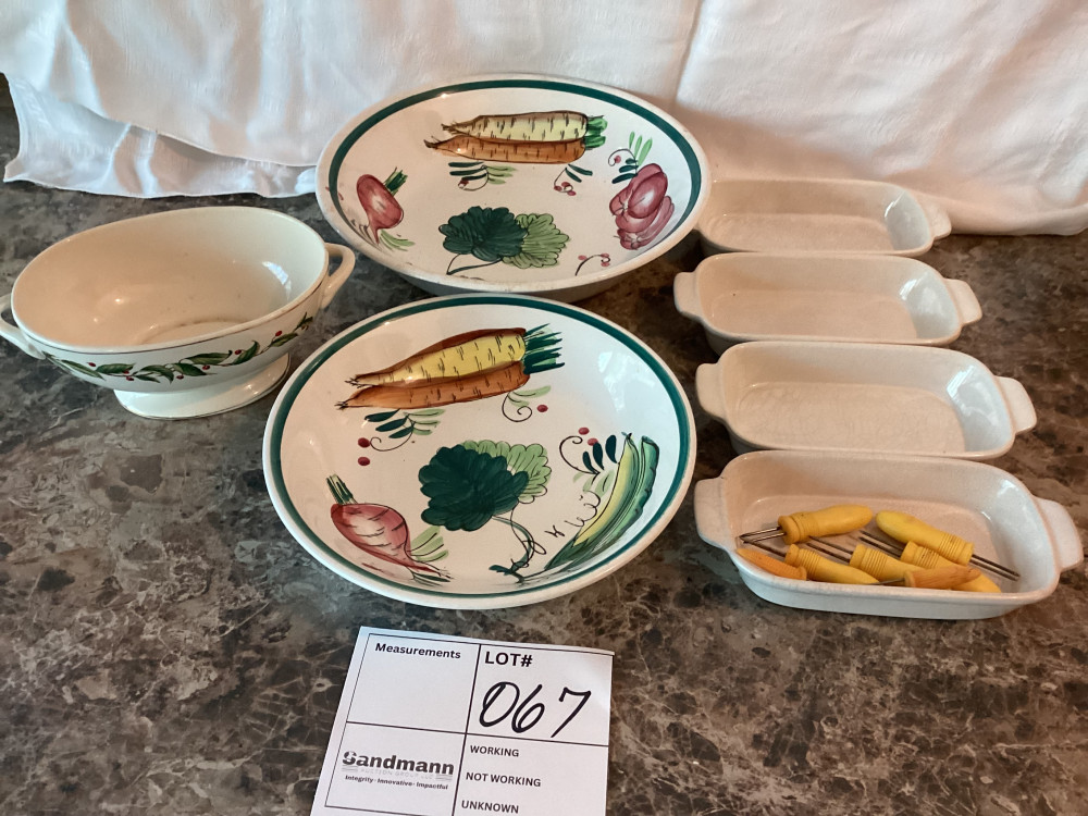 2 plates with painted vegetables, 4 white rectangle dishes, corn on the cob holders, and a bowl