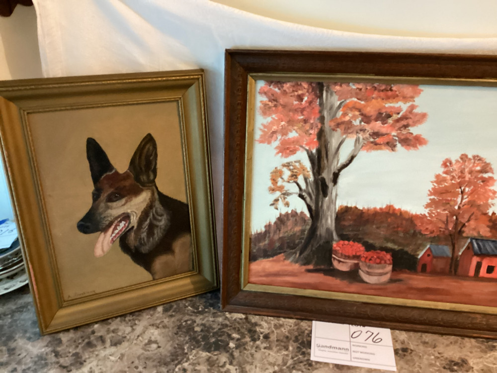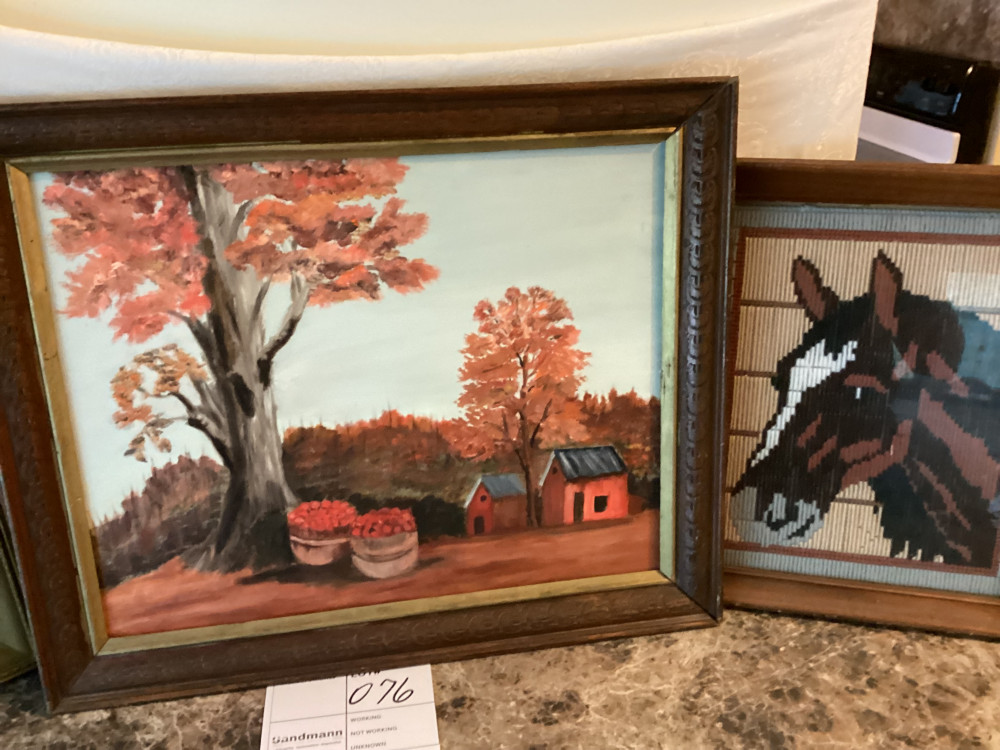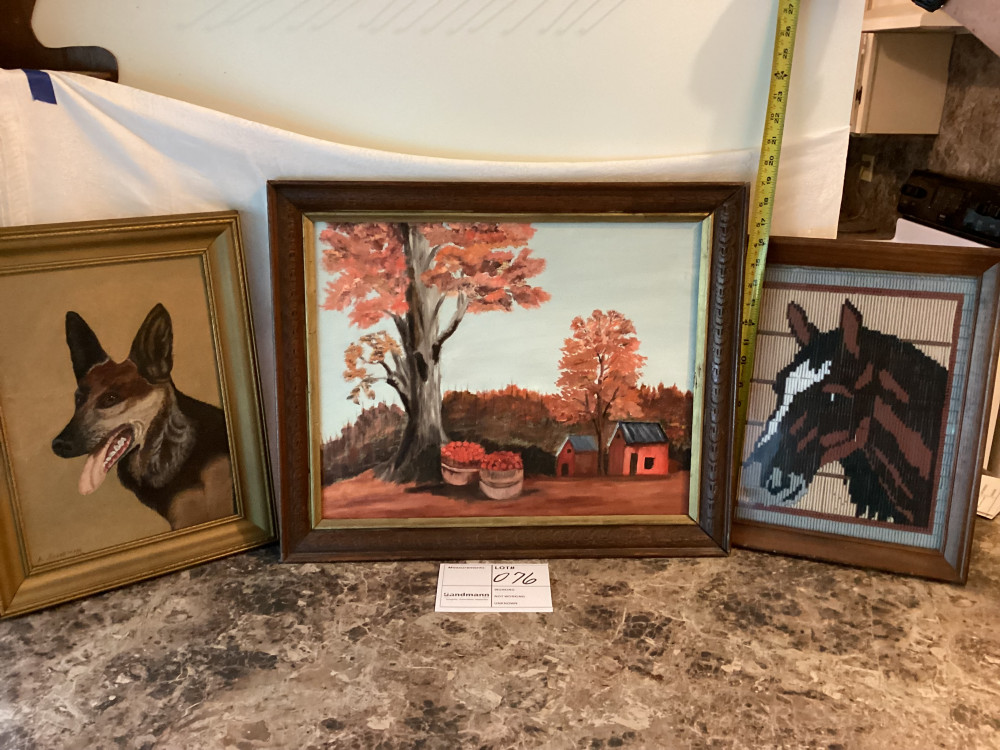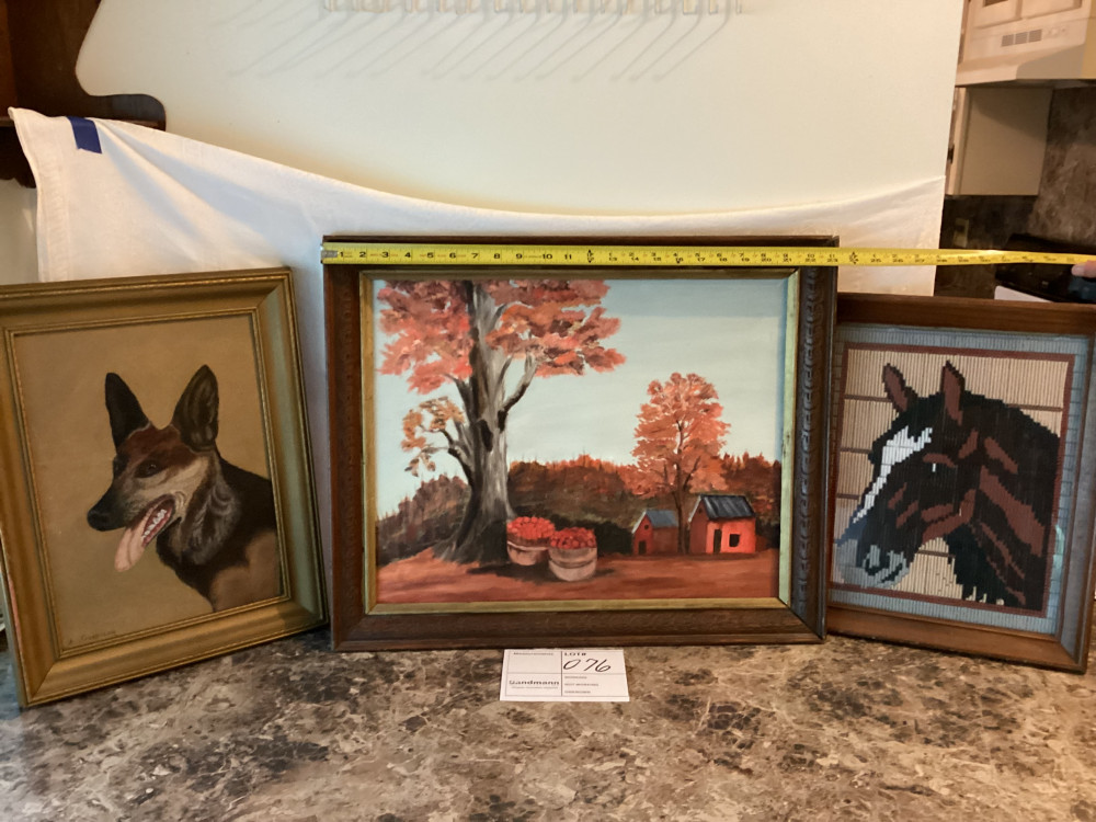 horse and dog framed picture and a picture of little house and trees