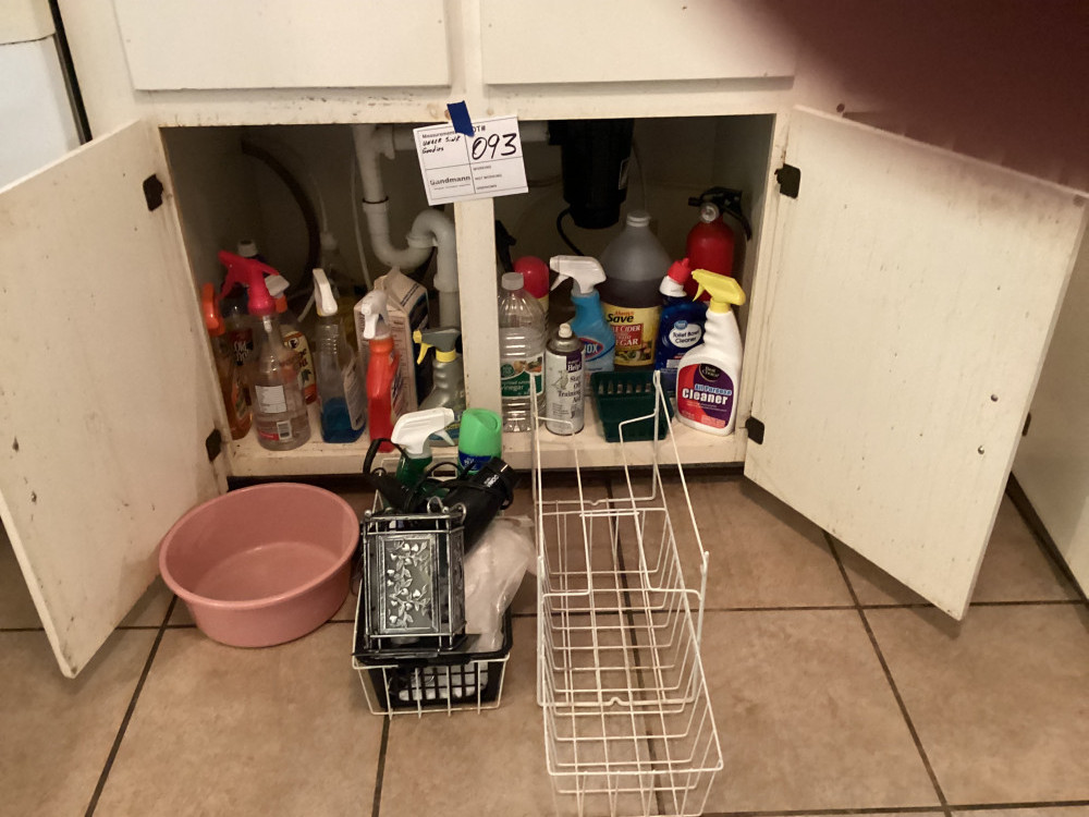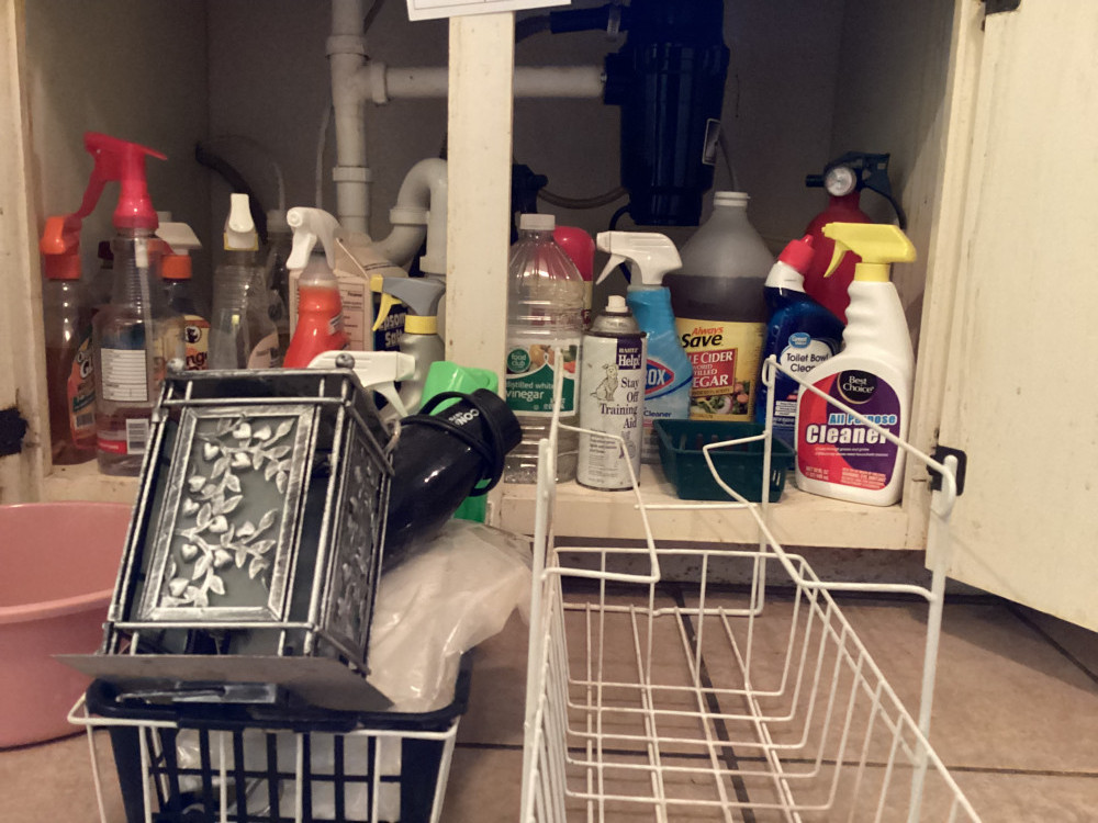under sink clean out; comes with cleaners wire rack, pink bowl