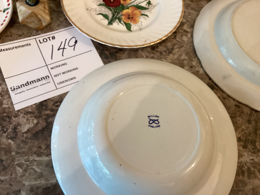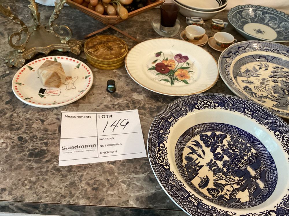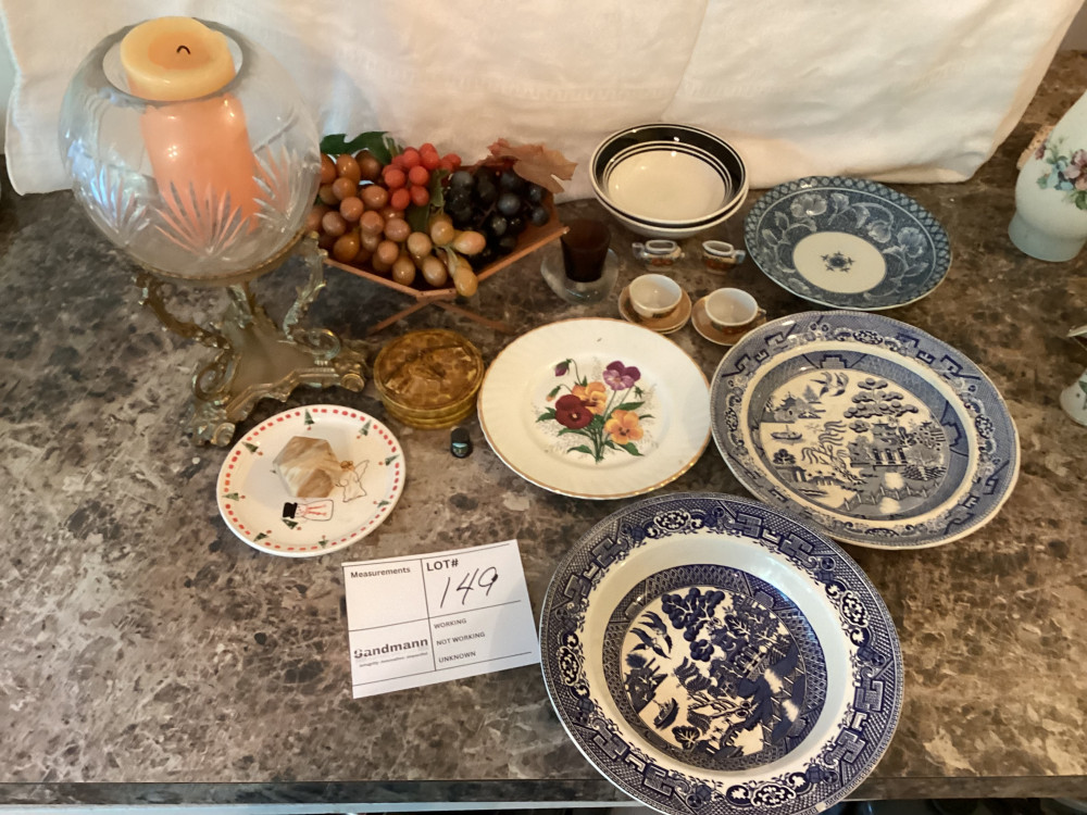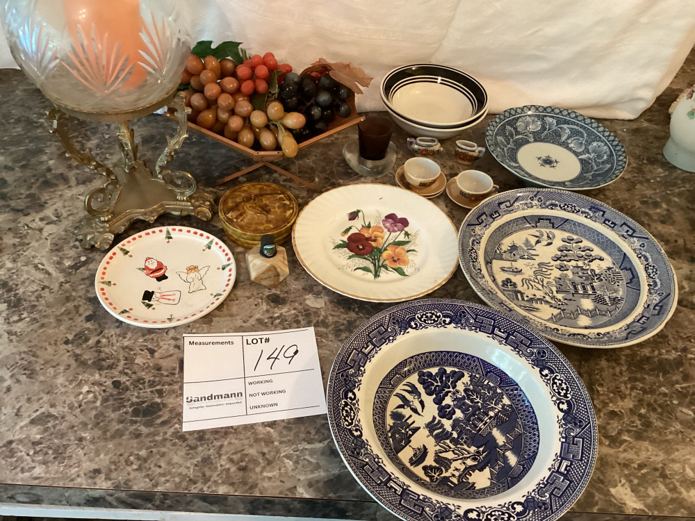 bowl of fake fruit, santa plate, blue and white plates, flower plate, white with black rimmed bowl, candle holder
