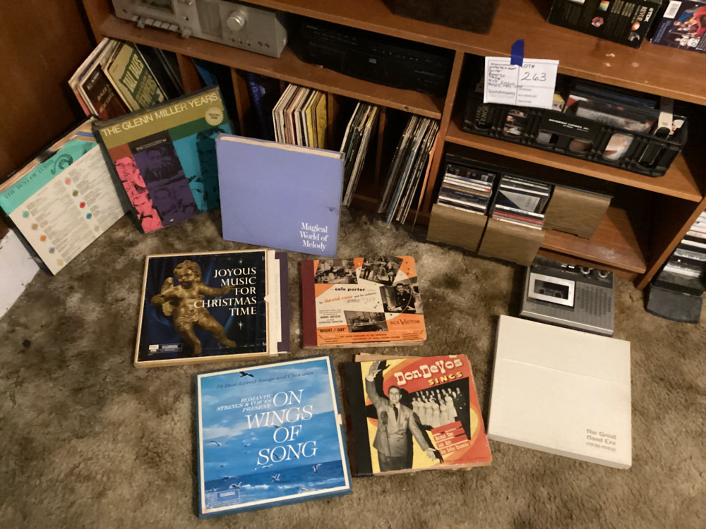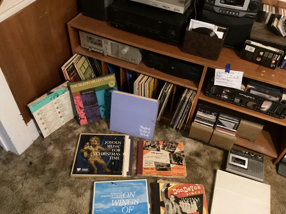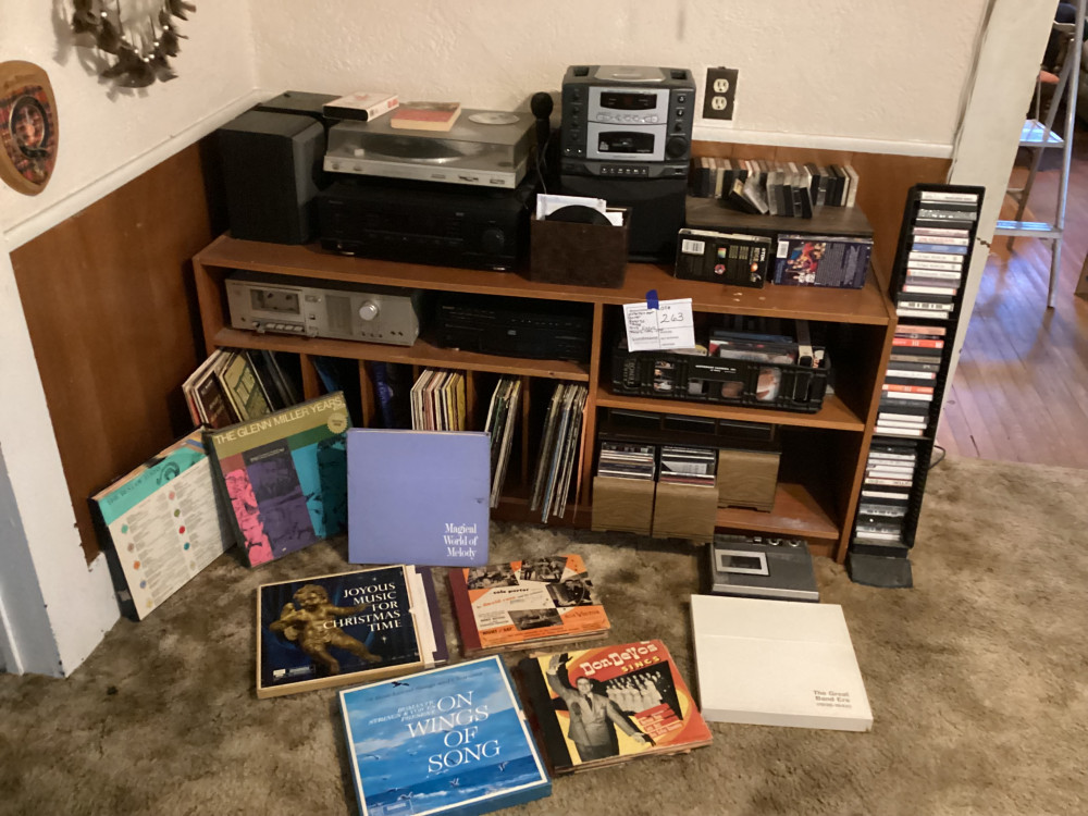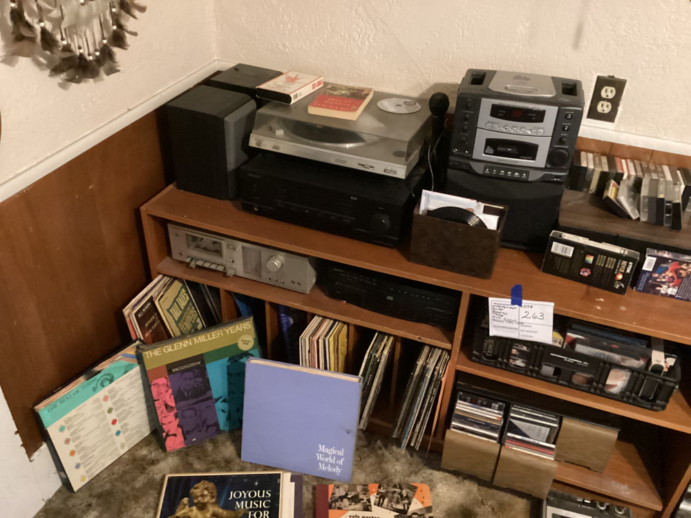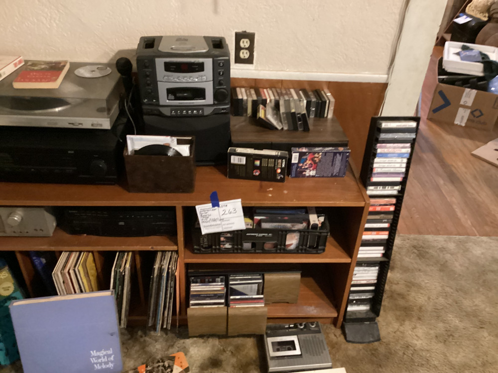 brown shelf, tapes, records, everything in picture
