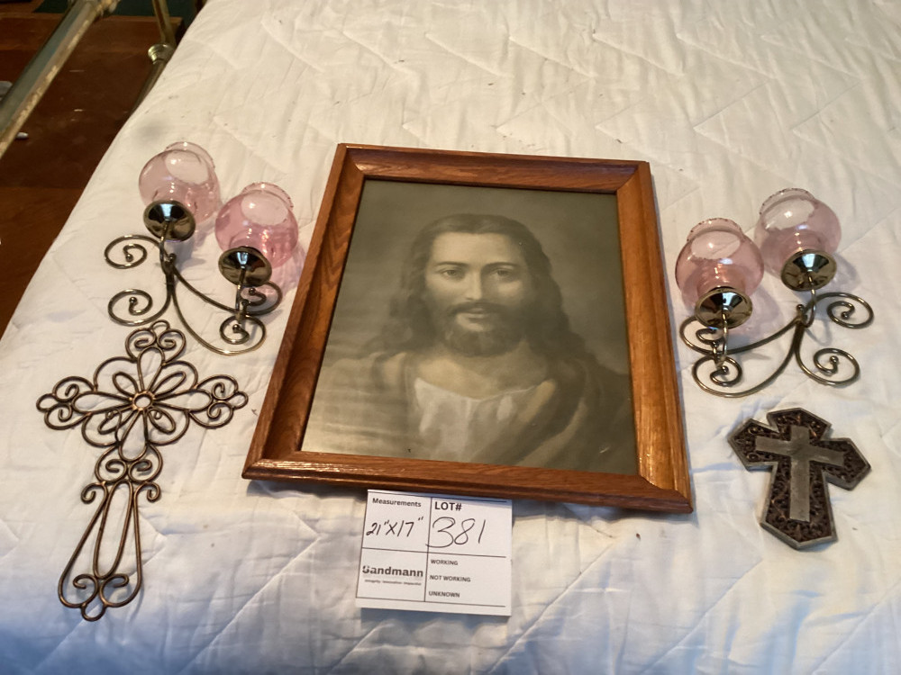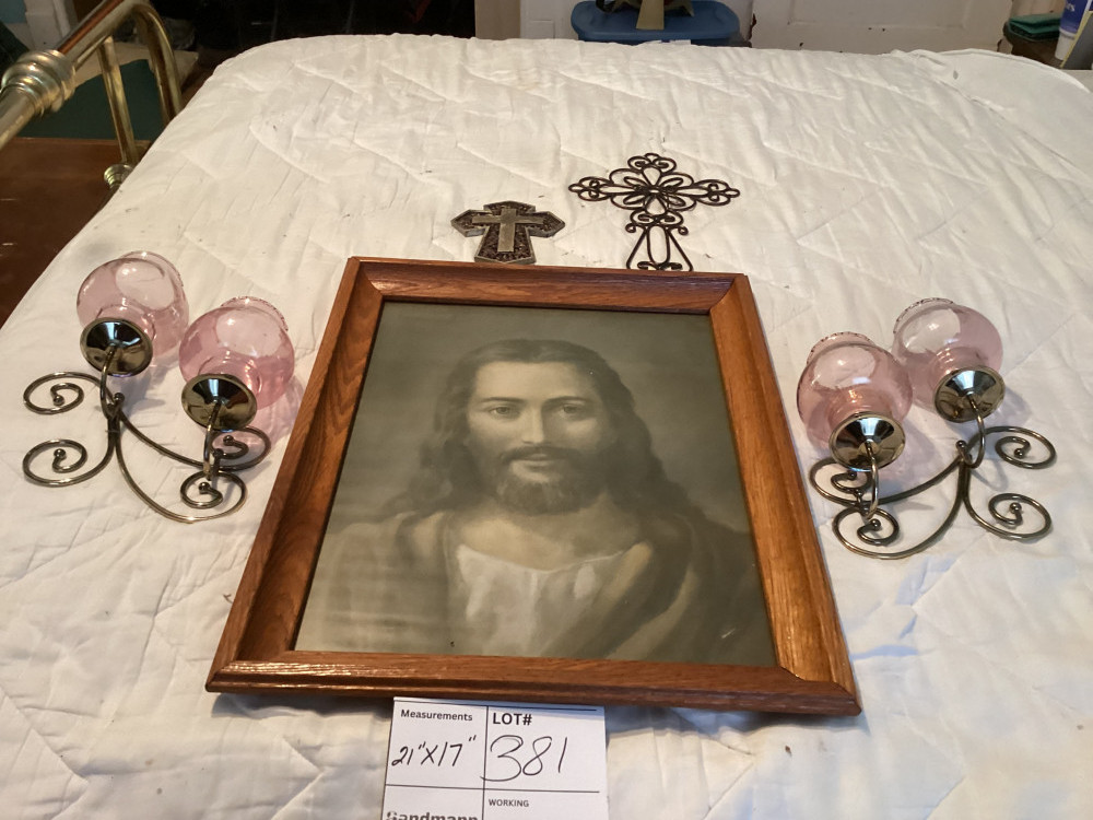 framed 21 x 17 set of two pink glass candle holders, and 2 crosses