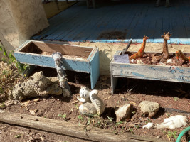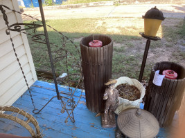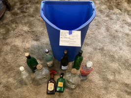 # 610 — Decorative Bottles & Blue Trash Can